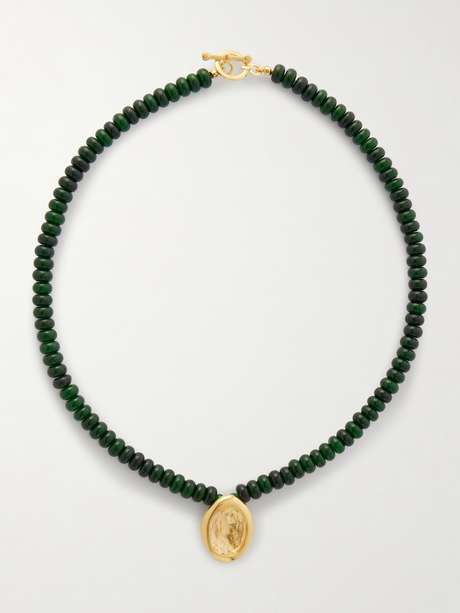 Drawing on ancient mythology and artisanal tradition, Ysso approaches jewelry as a form of storytelling, where each piece carries symbolic weight. The 'Aesop' necklace centers on sculptural jade framed by textured gold-plated elements, its composition evoking a relic.