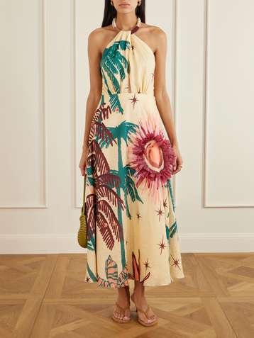 Appliquéd printed leather-trimmed linen-blend halterneck maxi dress