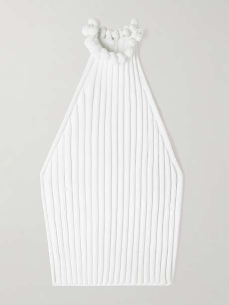 Creative Director Pieter Mulier continues to honor Azzedine Alaïa’s legacy for Summer-Fall ’25, channeling the founder's passion for sculptural precision and contouring fits. Debuted on the runway, this top is rib-knitted in a close, cropped design and has a high neckline outlined with dimensional spirals.