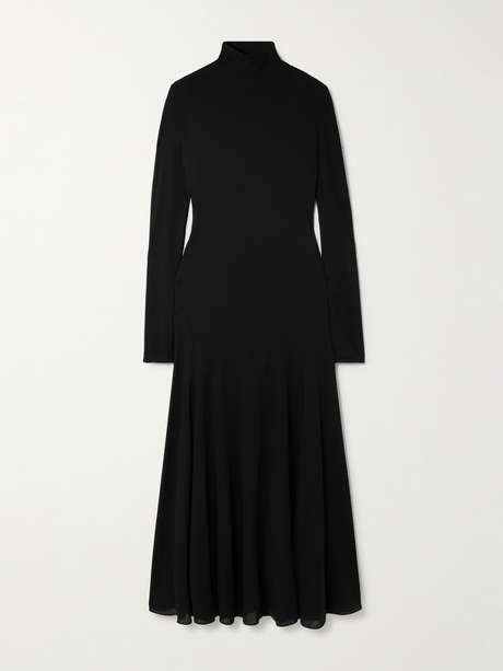 Alaïa's dress has a heart-shaped cutout at the back. Made from jersey, it fits slim through the bodice and falls to a swishy midi skirt. Complement the turtleneck with jaw-grazing earrings.