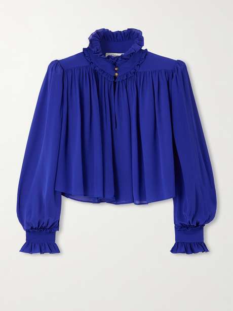 We love how Chemena Kamali's Chloé girl is evolving for SS26. This blouse is cut in a slightly cropped fit from fluid silk-georgette that falls and drapes so well. It has a high, ruffled neckline, lightly puffed shoulders and blouson sleeves.
