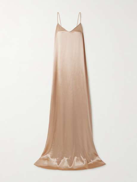 Ferragamo's show-stopping gown was styled with strappy sandals on the Fall '25 runway – no jewelry necessary. Cut from fluid satin in a shimmering gold shade, it hangs from slim straps and skims the figure before falling to the floor.