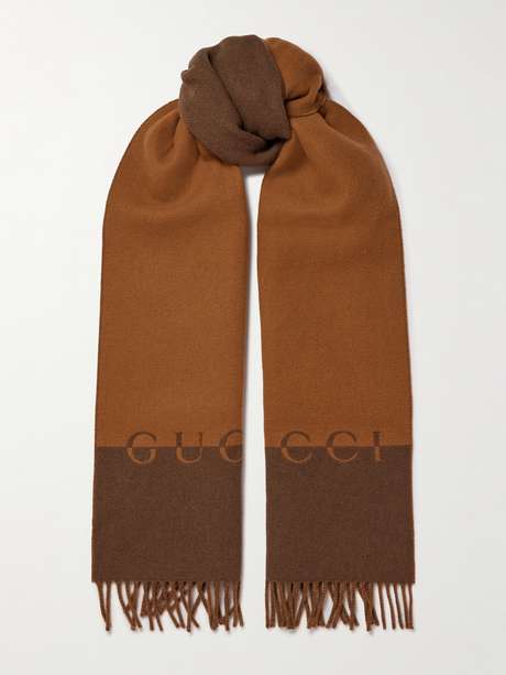 Gucci's scarf is jacquard-knitted in a two-tone palette with its logo across the ends. It's made from a soft wool and cashmere-blend and trimmed with fringing.