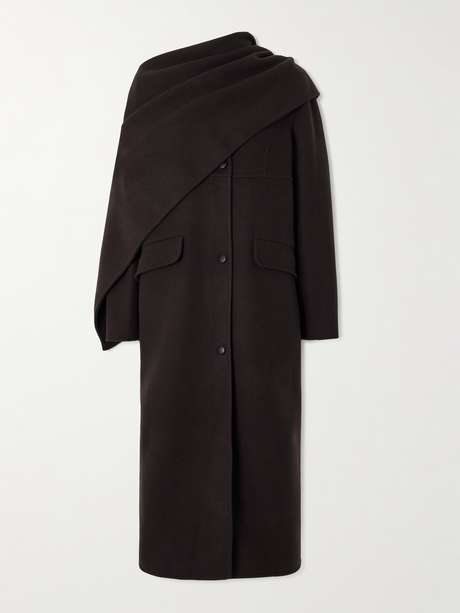 LIBEROWE’s ‘Kipling’ coat is tailored from pure cashmere in a longline silhouette, complete with front pockets and a built-in scarf — a key detail this season. Rendered in a rich chocolate hue, it works as a versatile neutral within any wardrobe.