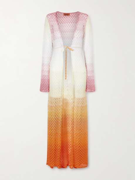 Missoni's coverup is crochet-knitted with its signature zigzags in a warm, colorful gradient. Flecked with metallic threads, it has an enveloping silhouette cinched by ties at the waist. Take it with you on your next trip, be it to Saint-Tropez or St. Barts.