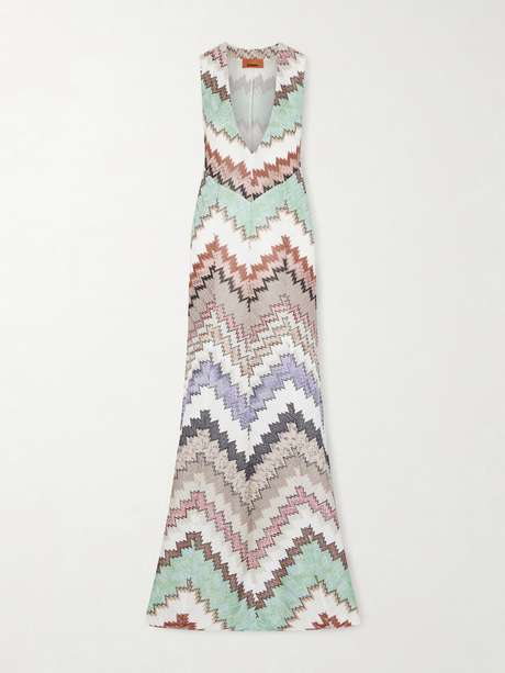 Missoni's iconic zigzag stripes are blown up to grander proportions across this maxi dress. Woven with light-catching metallic fibers, it's tailored with darted seams and panels to define the waist and give the floor-length skirt its softly fluted shape. Pull the low-cut neckline into focus with a dusting of body shimmer.