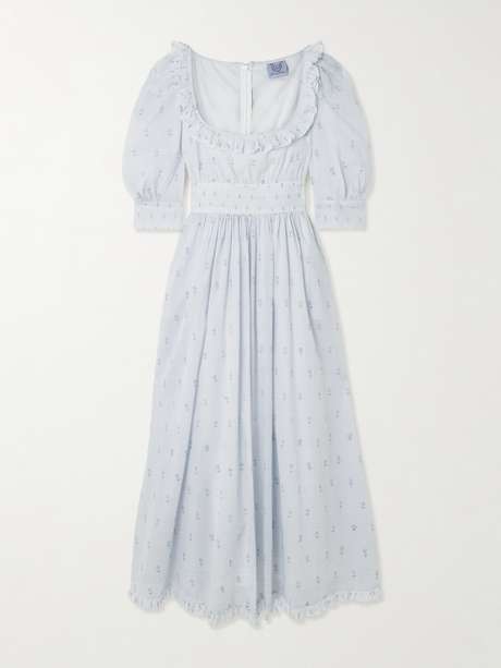 Thierry Colson's 'Yolande' dress evokes the romance of the Edwardian era. Made in India from lightweight cotton-voile, it cinches at the waist before flowing into a pleated midi skirt. The puffed sleeves and ruffled hem add to its charm, while the micro polka dots and florals make it even more dreamy and feminine.
