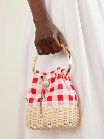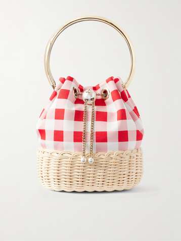 Bon Bon faux-pearl embellished woven raffia checked woven bucket bag