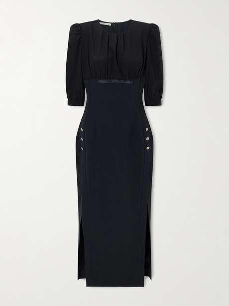 Glamorous '80s styles inspire Alessandra Rich's midi dress. Made from silk-cady, it has a gathered bodice framed by lightly puffed shoulders and fits slim through the empire waist and skirt. The crystal-embellished buttons lend a hint of sparkle.