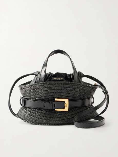 BALMAIN Shuffle mini buckled leather-trimmed raffia shoulder bag