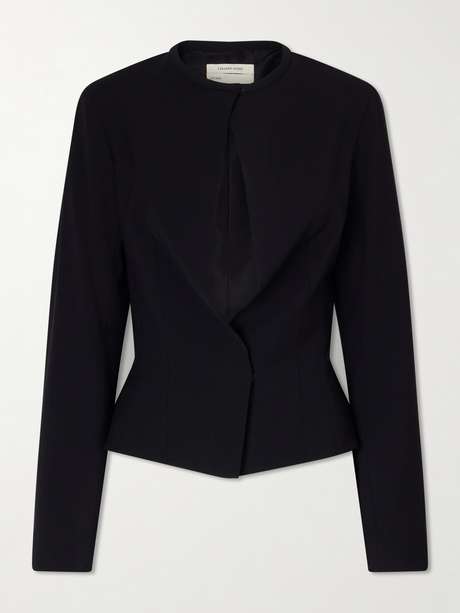 Tailored with a sculptural sensibility, this jacket by Colleen Allen is crafted from stretch wool for a fitted silhouette. Concealed hook-and-eye closures create a distinctive keyhole opening, while the silk lining ensures a smooth finish. It reflects the designer’s balance of precise tailoring and modern femininity.