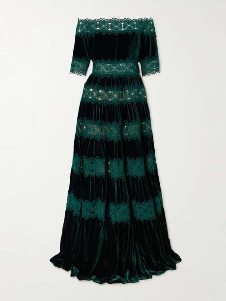EXCLUSIVE AT NET-A-PORTER. Costarellos' gown exudes drama. In stripes of lace and velvet, it has a fitted shape through the off-the-shoulder bodice and falls to a flared floor-skimming hem.