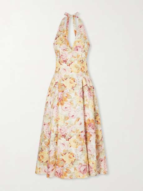 The floral print on FAITHFULL’s 'Murano' dress nods to ’70s influences, lending it a vintage-inspired feel. Made from breathable linen, it features a halterneck with a V-opening and a flowing midi skirt. Style it with pearl jewelry.