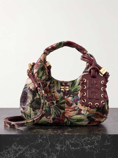 GANNI's tote is made from floral jacquard, inspired by vintage tapestry. It has leather trims and a branded luggage tag looped through the top handle. The inside fits your phone, tin of mints and house keys.