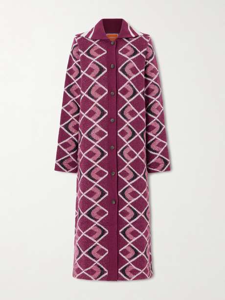 Italian label La DoubleJ is all about mood-boosting pattern and color. Sitting halfway between a cardigan and a coat, this style is jacquard-knitted with shimmery metallic thread and has a contrasting ribbed collar.
