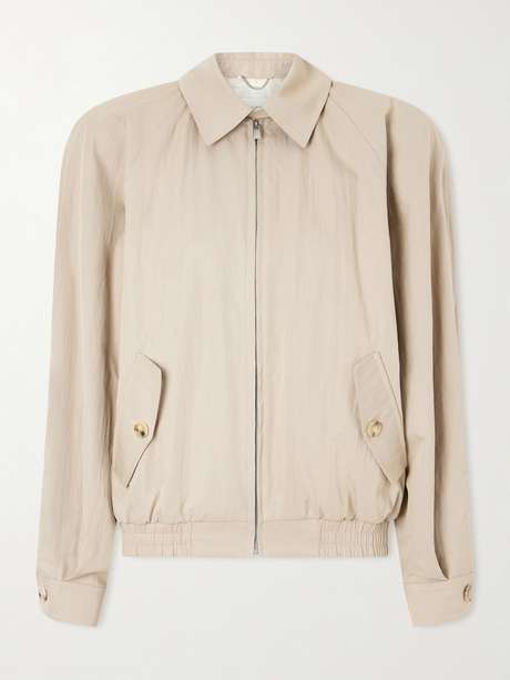 Magda Butrym's jacket is fitted with detachable shoulder pads to create a strong, '80s-inspired shape. Made from cotton-blend, it has a stand collar with a throat latch and an elasticated hem to temper the shape. The label's logo is embroidered at the nape using tonal threads.