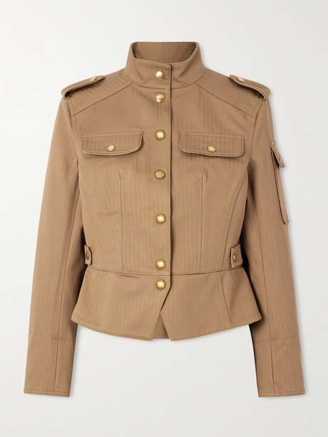 Classic tailoring principles inform the precise cut of McQueen's jacket. It's made from cotton woven with a neat herringbone and finished with logo-stamped gold-tone buttons and epaulettes, á la military styles.