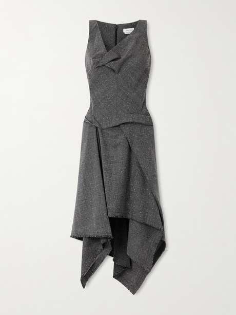 Sharp cuts and asymmetric lines are key themes in McQueen's collections. Made from flecked wool patterned with Prince of Wales checks, this dress is softly gathered at the neckline and hips and falls to a hankerchief hem with frayed edges. Wear yours with point-toe pumps and minimal jewelry.