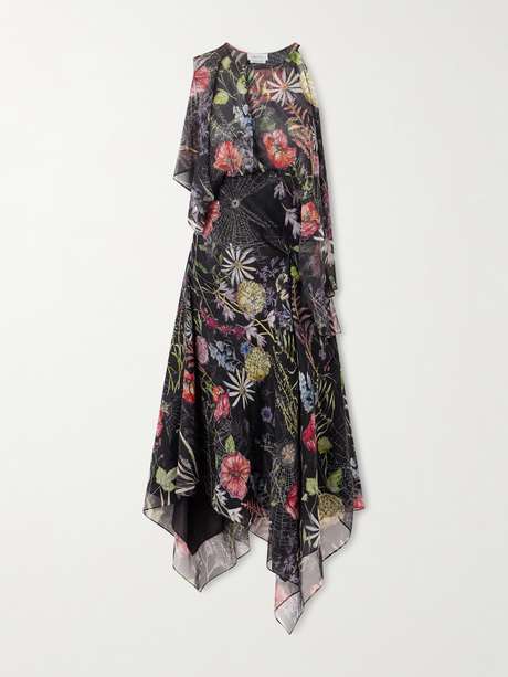 McQueen's midi dress combines pretty flowers with wispy spiderwebs for a gothic twist to the print. Cut from sheer silk chiffon, it's layered and gathered into cascading ruffles with a floaty asymmetric hem.