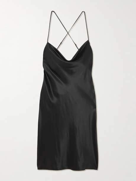 There's nothing as iconic as a little black dress. SAINT LAURENT's version has been made in France from pure silk with a satin finish, and is suspended from criss-cross straps. It's cut for a close fit, with an effortless drape from the chest to the skirt.