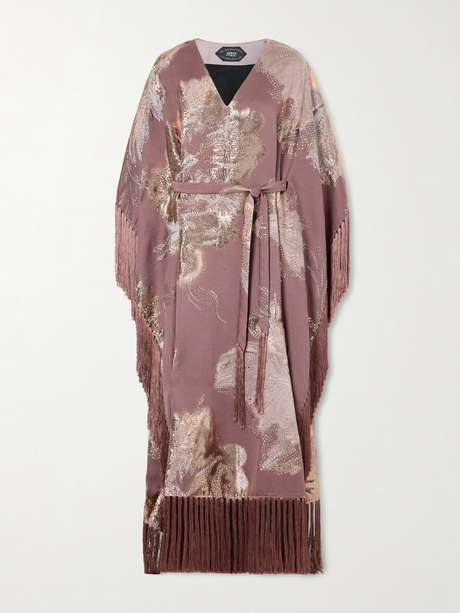Taller Marmo's 'Dawn Royale' kaftan has a floaty silhouette that moves like a dream. It's draped from crepe that's artfully embellished and trimmed with fringing – a bohemian signature of the glamorous designer.