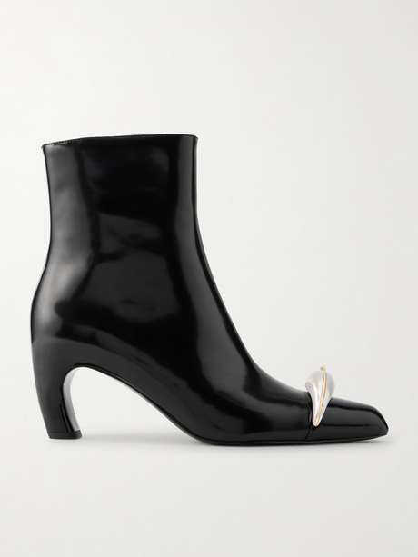 Part of the 'Pierced' collection, Tory Burch's ankle boots are studded with signature silver hardware. Made from glossy leather, they have sleek curved heels, emphasized by the covered construction. They'll add interest to even the simplest outfits.