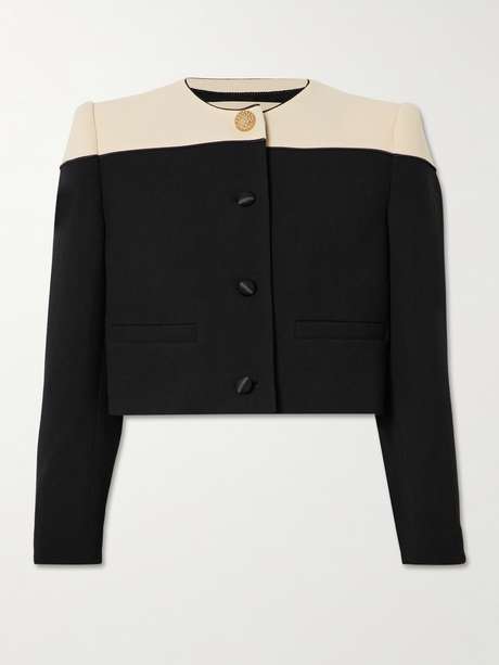 A creamy panel skims the padded shoulders of Valentino Garavani's jacket – a chic, unexpected touch. It's tailored from black wool with sharp lines and tonal buttons. Coordinate your jewelry to the one mismatched gold-tone button at the top.