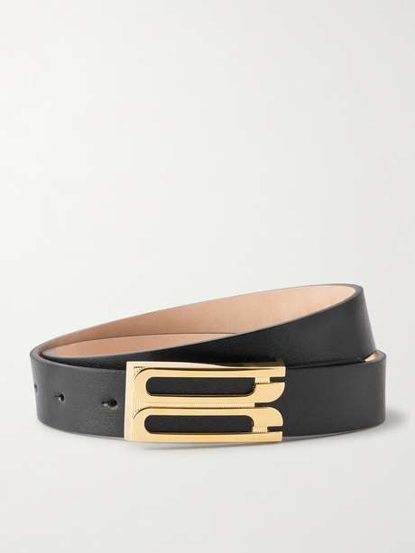 Victoria Beckham's 'Frame' belt shines with a gold-tone buckle shaped artfully and subtly like a 'B'. It's made from textured leather and is sturdy enough to cinch jackets.