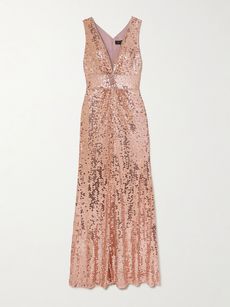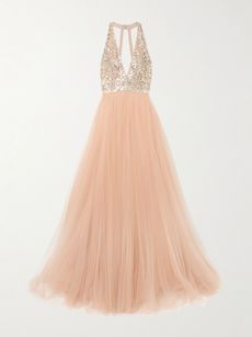 A dazzling floor-length rose-gold sequinned maxi dress with a deep V neckline and sculpted bodice is a beautiful choice for a birthday party or a black-tie gala, while a dramatic gown featuring a meticulously beaded silvery V-neck bodice feels red-carpet-ready thanks to an open back with criss-cross straps, and a gorgeously ethereal blush tulle skirt that flows into an elegant sweeping train.