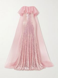 The pink theme continues with a baby-pink strapless dress featuring cloud-like chiffon ruffles at the neckline and a body-skimming sleek column silhouette of tonal sequins. At the back, a sheer pink overlay falls to the floor, adding movement and a little drama. “Pink this season isn’t just playful, it’s powerful,” says Packham. “From soft blush to vibrant fuchsia, it has a joyful femininity that really suits the mood right now. After seasons of minimalism, I think women are craving color that uplifts.”