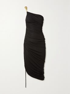 One-shoulder asymmetric embellished satin-jersey midi dress