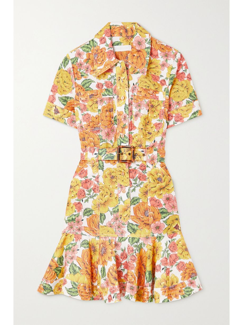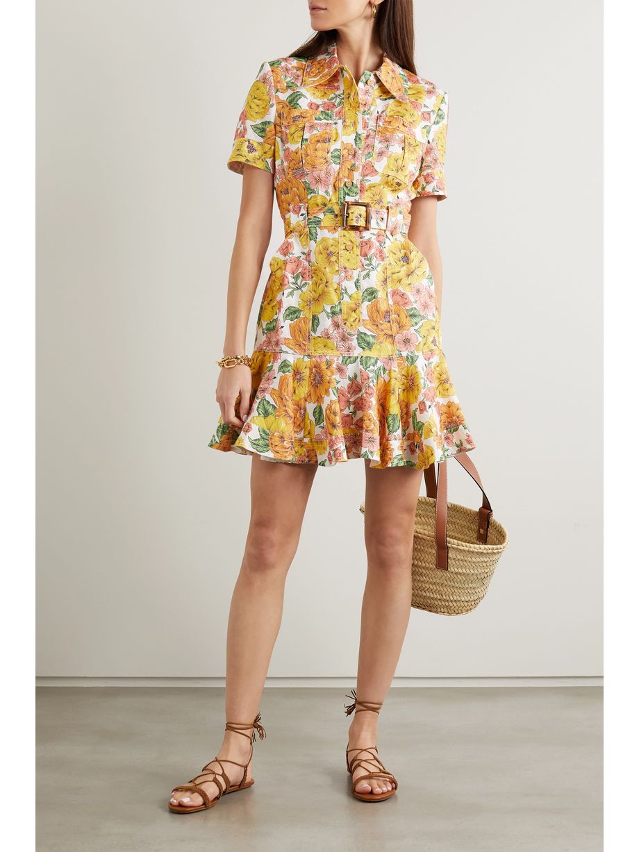 Poppy belted ruffled floral-print linen mini dress