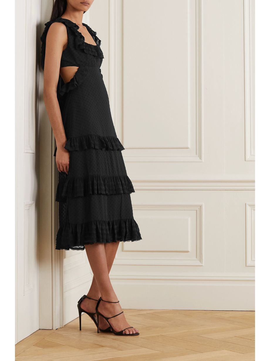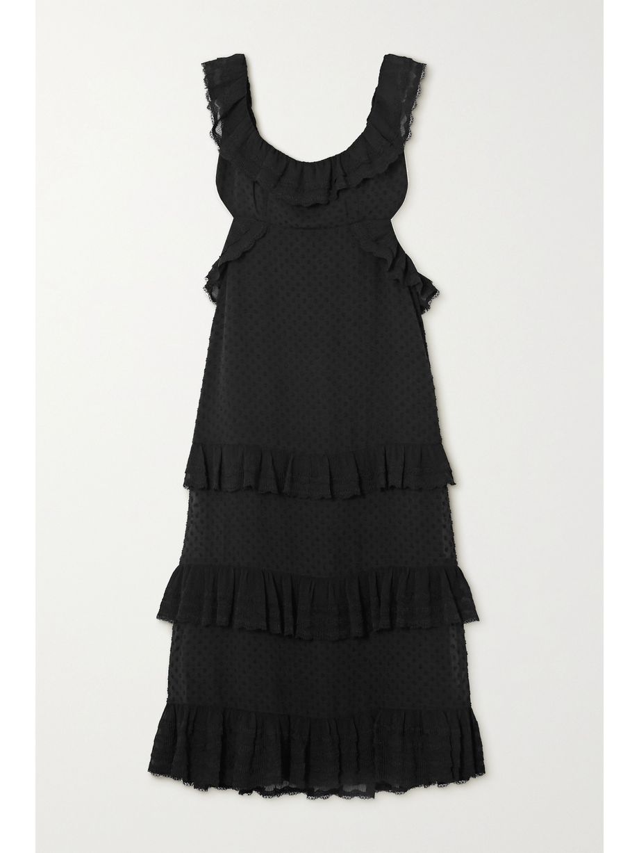 Ruffled chiffon and lace-trimmed Swiss-dot crepe midi dress