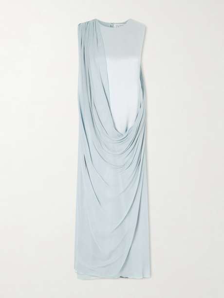 Abadia’s 'Rand' gown is defined by its sculptural movement. It’s designed with a lustrous satin base, overlaid by an artfully draped chiffon panel that sweeps across the body before falling to a fluid hem.