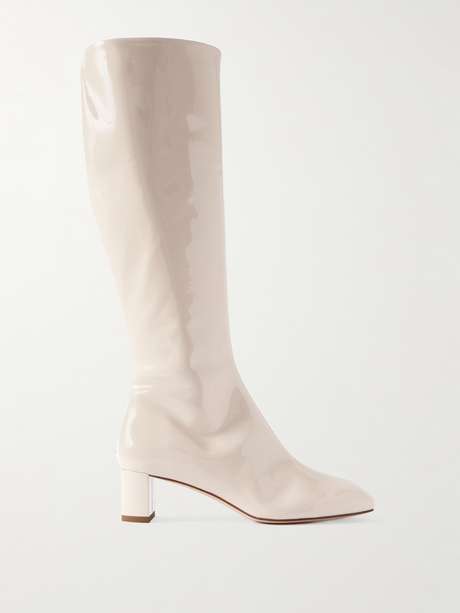 Aeyde's 'Marty' knee boots are reminiscent of chic '60s styles. Crafted in Italy from patent-leather, they have square toes with rounded edges and rest on block heels that offer 50mm of comfortable lift. The label's signature red stitch details the back of each.