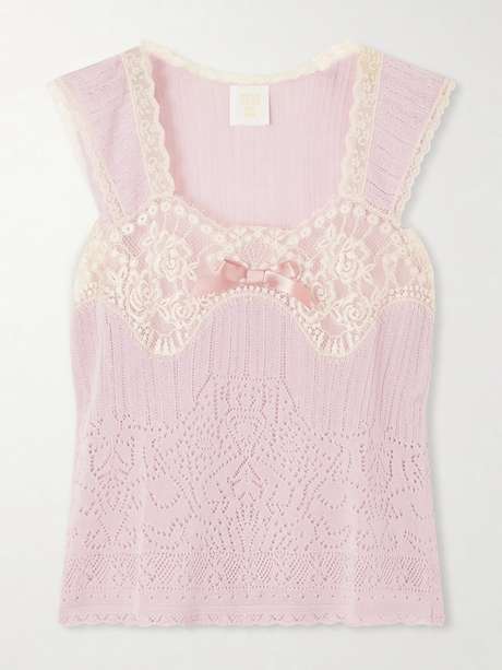 Anna Sui's 'Lingerie Lace Knit camisole' in blush is designed with a soft, stretchy knit that fits close to the body for a flattering silhouette. Delicate lace trims the bust and cap sleeves, while a small ribbon bow at the center adds a subtle romantic detail. Lightweight, it pairs naturally with the matching cardigan.