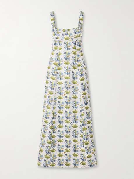 Emporio Sirenuse’s 'Azzurra' midi dress returns in a breezy linen-cotton blend, ideal for warm weather. Printed with the floral 'Celestine' motif, it keeps the signature corset-style bodice and dramatic open back that define the silhouette.