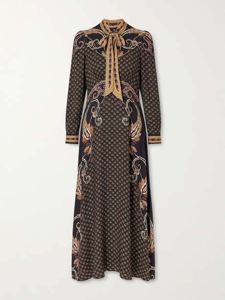 Paisley is central to Etro’s identity. Made from lightweight satin, this dress is finished with a sweet pussy-bow framing the high neckline and has slightly puffed sleeves. Style it with minimal sandals.