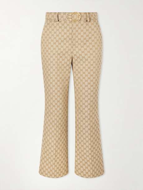 Gucci's bootcut pants are inspired by the 'La V.I.C.' and 'La V.I.P.' archetypes from Demna's inaugural collection, 'La Famiglia'. Made in Italy from canvas-jacquard, they feature the distinctive 'GG' monogram and 'Dionysus' detailing on the belt – a more-is-more approach that calls for styling with the matching coat.