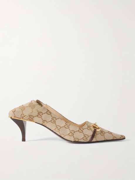 GUCCI Vittoria collapsible-heel horsebit-embellished leather-trimmed canvas-jacquard pumps
