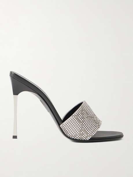 Make a statement with Gucci's 'Trinity' mules, designed to elevate your style and make you shine. Encrusted with a multitude of crystals, they feature subtle 'GG' emblems, leather footbeds and sculpted silver-tone heels.