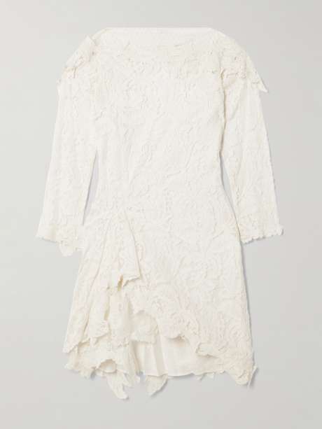 Isabel Marant's Fall '25 runway was presented in the Palais Royal gardens, where models walked to electronica. Inspired by the city girl and New Wave aesthetics, the 'Rubiana' cotton-blend lace dress nods is cut with a handkerchief hem and paneled with sheer tulle along the neckline. It comes with a paisley satin-jacquard slip for coverage.