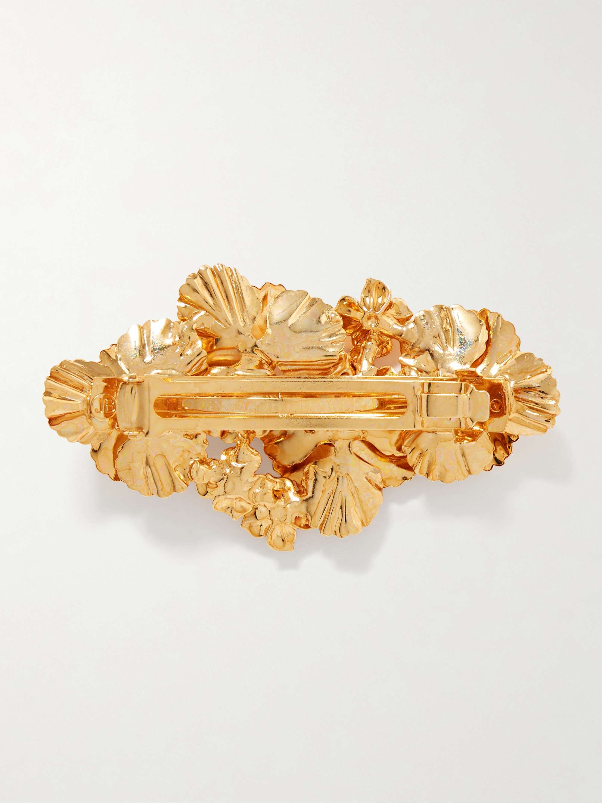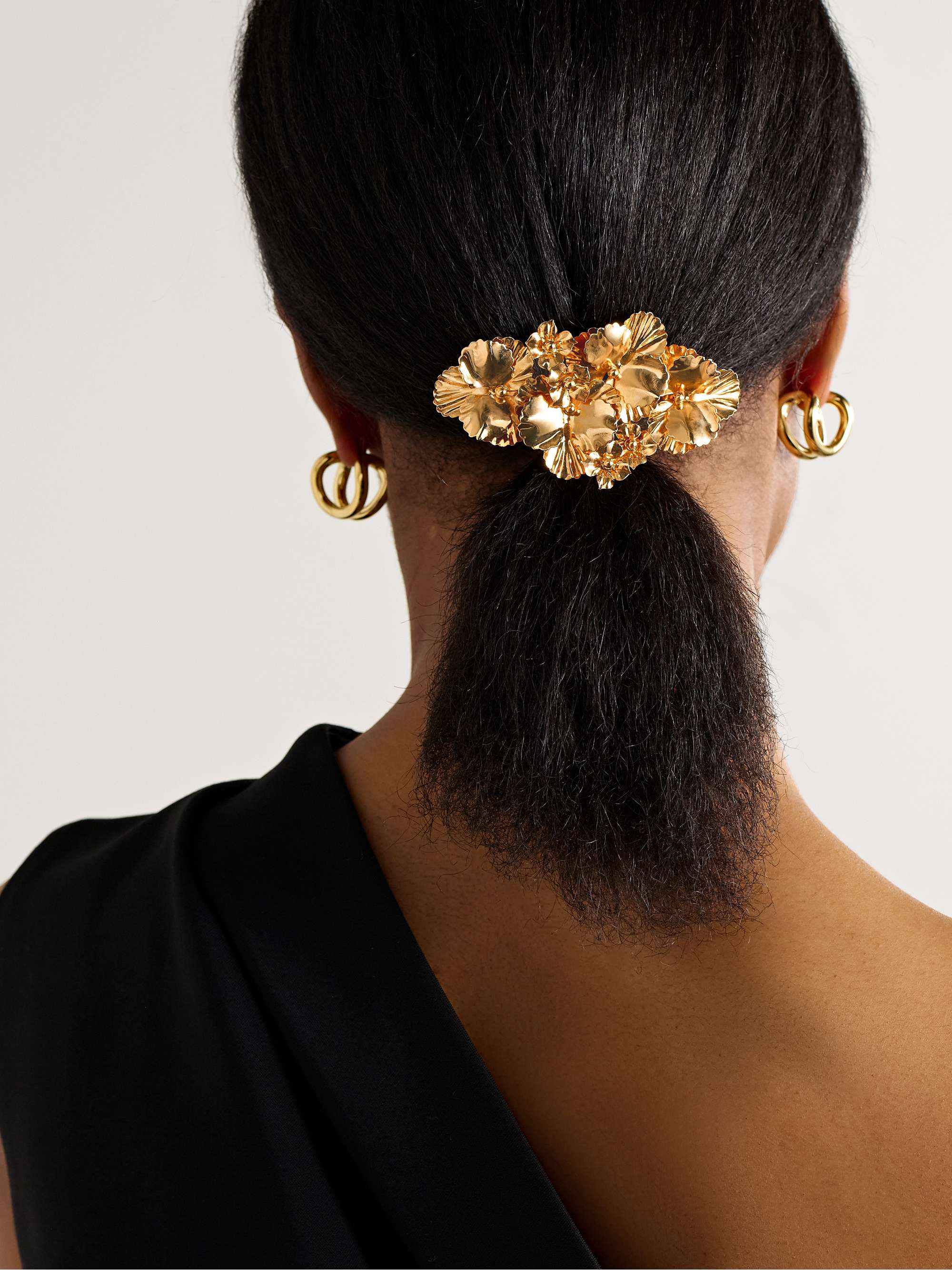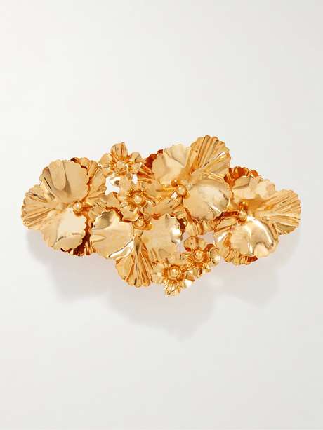 Jennifer Behr's hair clip is sculpted from gleaming gold-tone metal in the shape of blooming pansy flowers. It will add a romantic finish to updos, braids or loose waves.