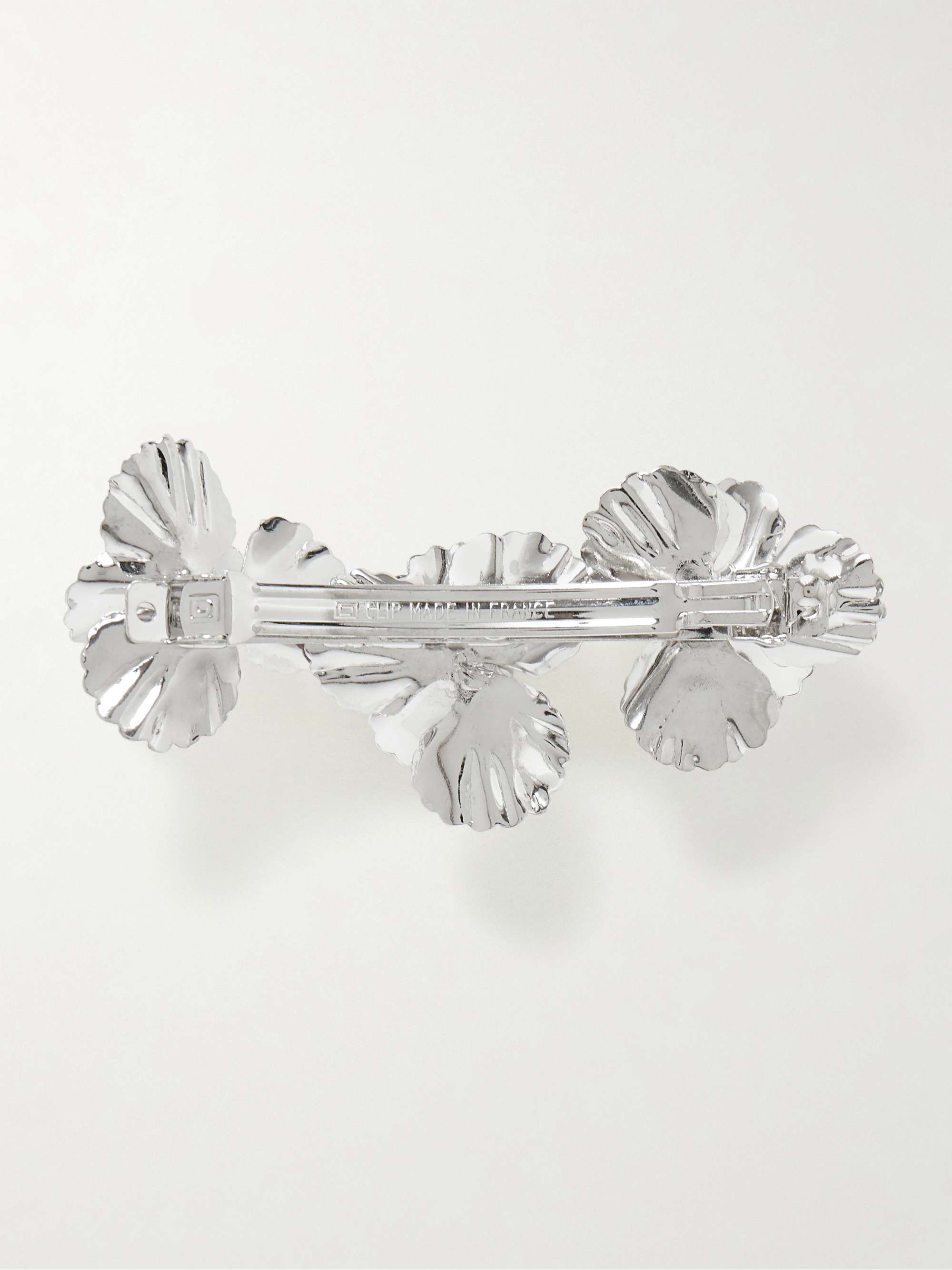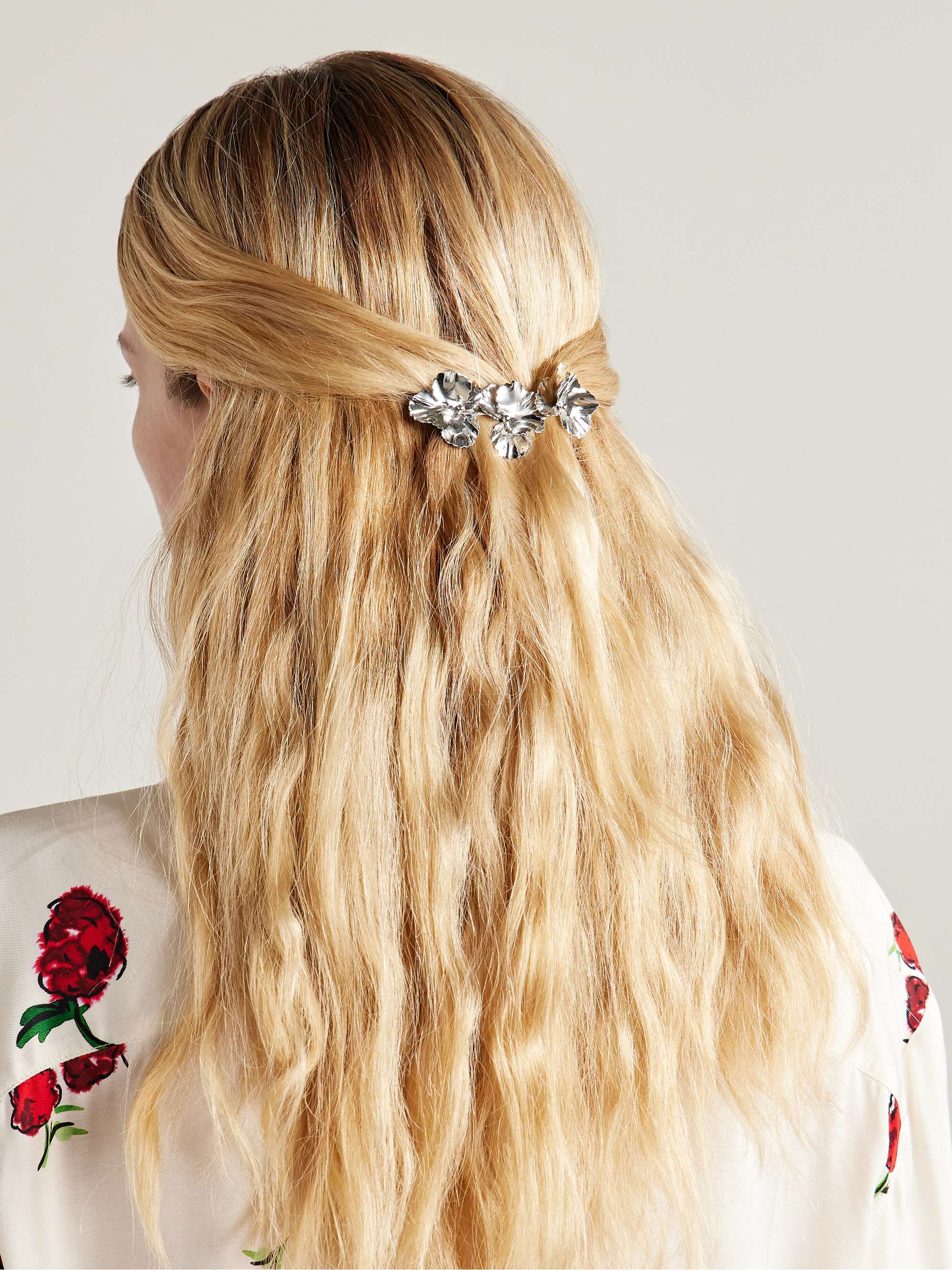 Jennifer Behr's hair clip is sculpted from silver-plated metal to create a trio of delicate pansy flowers. Slip it into any updo for a polished touch.