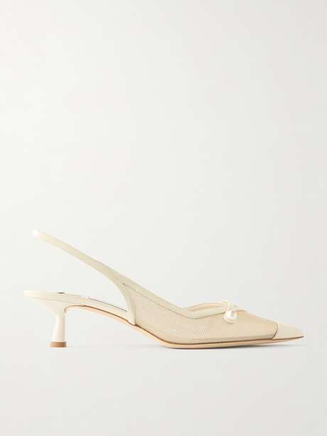 JIMMY CHOO Amita 45 faux-pearl embellished patent-leather trimmed metallic mesh slingback pumps