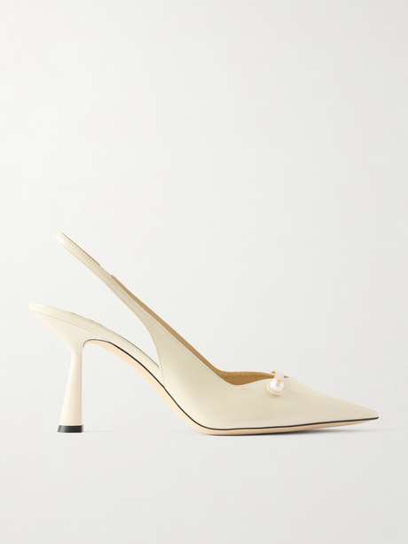 JIMMY CHOO Amita 85 faux-pearl embellished patent-leather slingback pumps