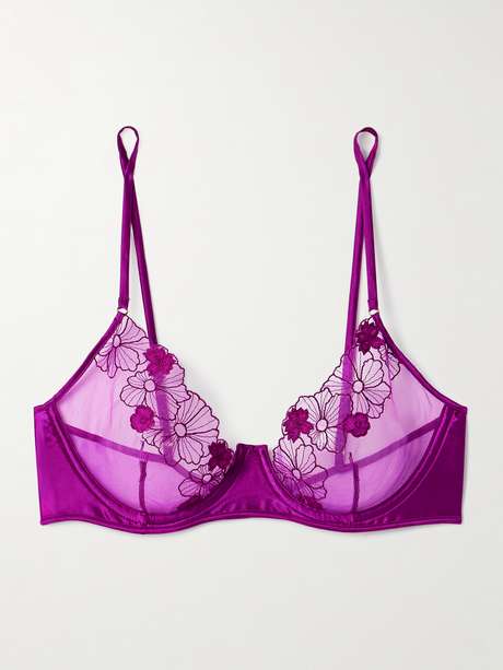 Kiki de Montparnasse's 'Violet' bra is cut from magenta tulle that's embroidered and appliquéd with the namesake flower. Trimmed with silk-blend satin, it has underwired soft cups and rests on adjustable straps. Complete the set with the matching thong and suspender belt in our edit.