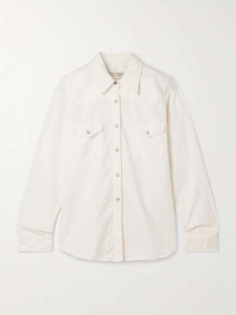 Nili Lotan's 'Travis' shirt is made from ivory denim and has a curved seam along the yoke and glossy snap fastenings. Tuck the curved hem into a pair of the brand's tonal jeans.