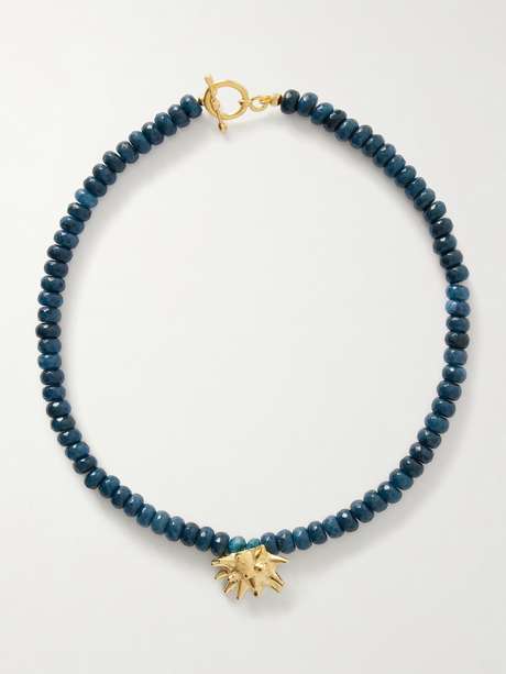 The 'Sea Urchin' necklace by Ysso blends organic texture with refined craftsmanship. Strung with deep teal jade beads, the silhouette is anchored by a sculptural gold tone sea urchin pendant, delicately detailed to capture its natural form.