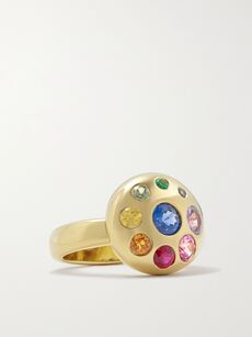 Beautifully cut rainbow sapphires and an emerald are set in gold for this statement-ring design, part of New York-based designer Brent Neale’s Petal collection. An eye-catching addition to your jewelry box, this playful piece will bring a touch of color to warm-weather whites.
